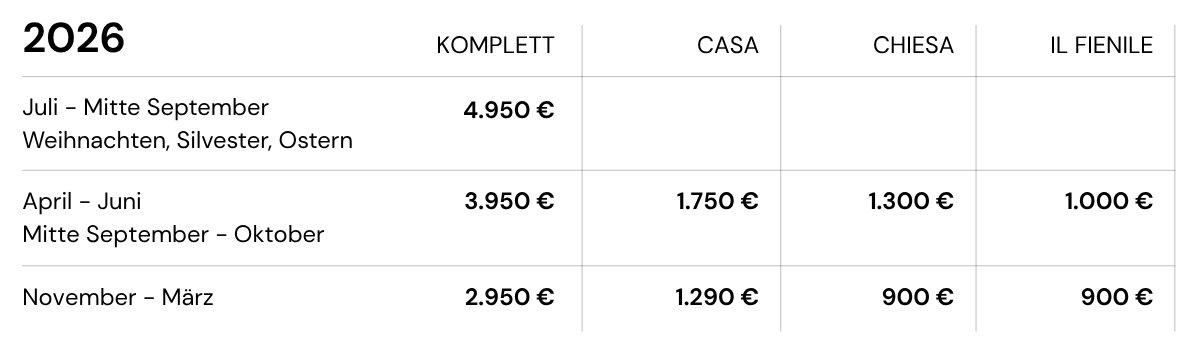 In den Sommermonaten Juli bis Mitte September sowie an Weihnachten, Silvester und Ostern vermieten wir das gesamte Anwesen nur als Ganzes – so hast du Platz für deine Familie oder eine Gruppe von Freunden mit maximaler Privatsphäre auf dem ganzen Gelände.